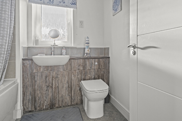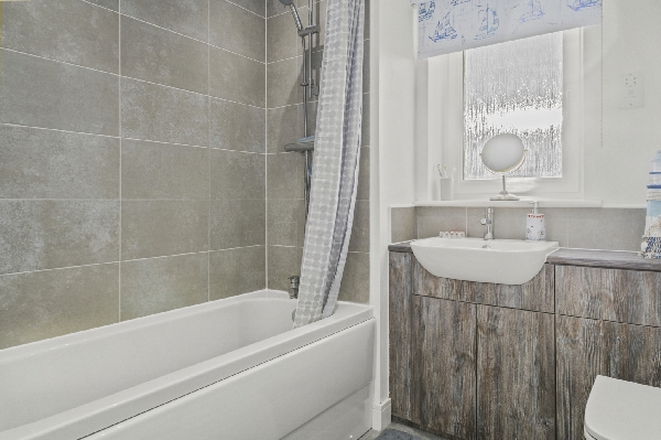 Upstairs, two well-proportioned bedrooms provide flexibility for home working, guests or growing households. The principal bedroom benefits from fitted wardrobes, while the modern family bathroom is finished with ceramic tiling, a mains-fed shower, integrated storage and a chrome towel radiator.