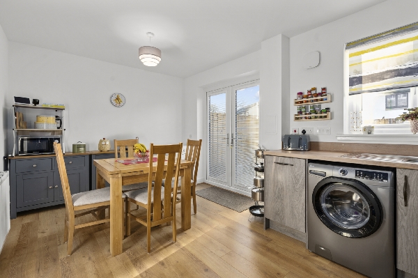 Internally, the accommodation is thoughtfully laid out and presented in excellent condition. A welcoming entrance hallway provides access to a contemporary ground-floor WC and leads through to the main living spaces. The front-facing lounge offers a comfortable and relaxing setting, while to the rear, an attractive open-plan dining kitchen forms the social heart of the home. French doors open directly onto the rear garden, creating an easy flow between indoor and outdoor living. The kitchen is finished in a modern style and includes integrated appliances such as oven, hob and extractor.