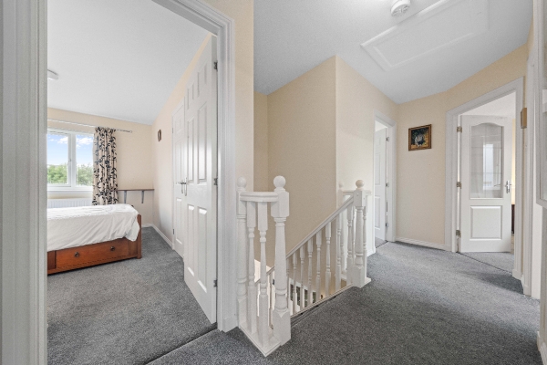 Upstairs, the first floor hosts a contemporary family bathroom and four generously sized bedrooms, each benefiting from fitted wardrobes for ample storage. The master bedroom further impresses with its own sleek ensuite, providing a private sanctuary for rest and relaxation.