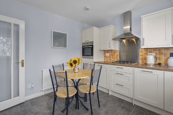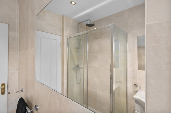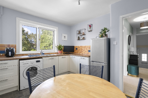 To the front, a bright and generously proportioned lounge offers a comfortable space for relaxation and entertaining. The modern dining kitchen is well-appointed with integrated white goods and ample space for casual dining. A stylish, contemporary shower room adds a touch of luxury, while two double bedrooms—both featuring fitted furniture—provide excellent storage and a sense of calm retreat.