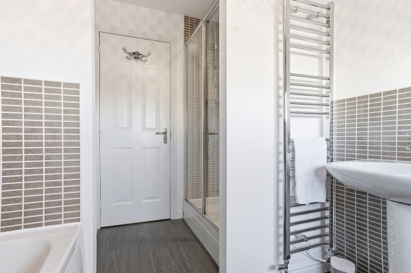 Completing the upper level is a stylish and well-finished shower room, presented in a fresh and contemporary style with quality tiling, walk-in shower and heated towel rail, ideal for guests or family living.