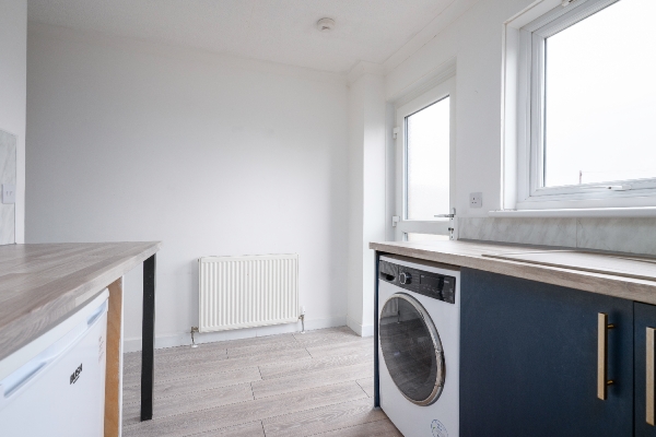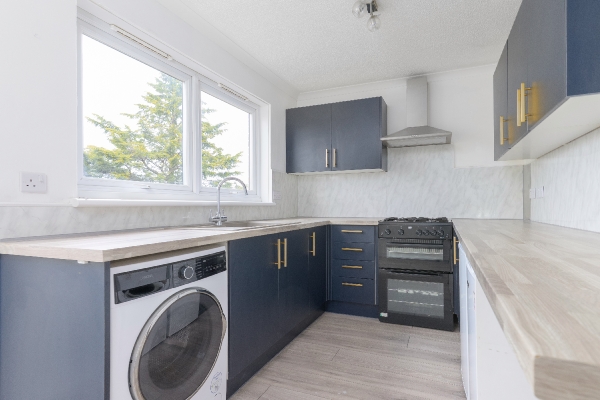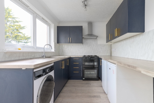 To the rear, the modern fitted kitchen offers an excellent range of wall and base units, generous worktop space and room for appliances. The layout is both practical and stylish, with direct access to the enclosed rear garden—ideal for everyday living and indoor-outdoor flow.