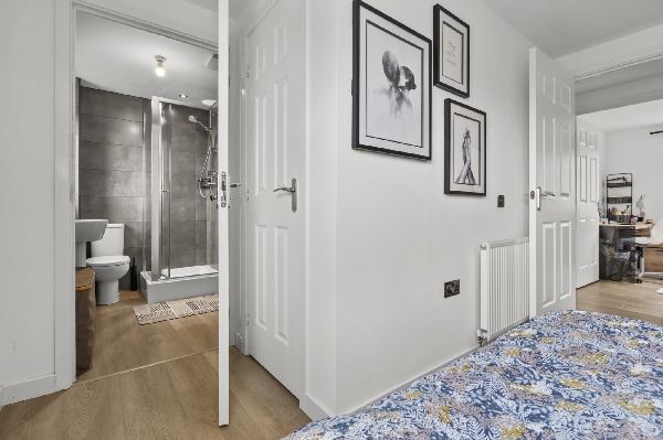 Upstairs, the home continues to impress with three well-proportioned bedrooms, offering flexibility for growing into over time — whether that’s a guest room, home office or future family space. The main bedroom enjoys the added bonus of its own en-suite shower room, bringing a touch of privacy and convenience that makes everyday routines feel that bit easier. The family bathroom is modern and fresh, completing the upper level with a clean, contemporary finish.