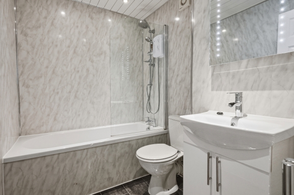 Upstairs, you’ll find two well-proportioned double bedrooms, both complete with fitted wardrobes, giving good built-in storage without taking away from the room space. The bathroom has been upgraded to a great standard, finished with full wet wall panelling for a clean, modern look. Complete with a bath, overhead shower and glass screen, along with a sleek vanity unit and LED-lit mirror, it’s a fresh, low-maintenance space that’s ready to use from day one.