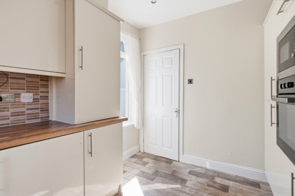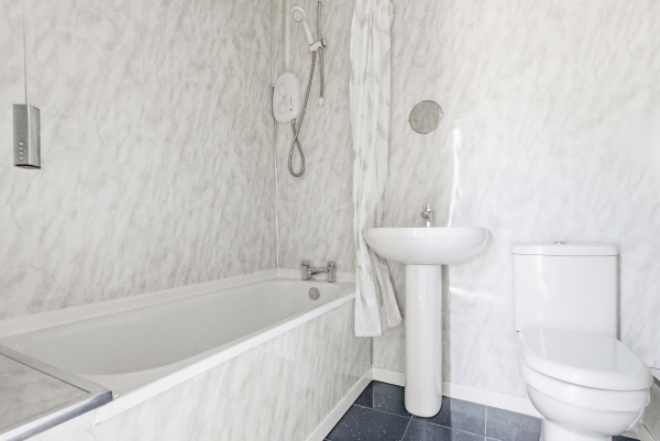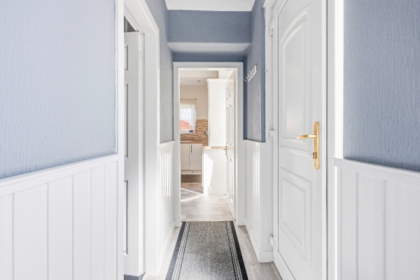 An internal hallway leads to a well-presented family bathroom, finished in a clean, modern style with a bath and overhead shower, and also provides access to the rear garden.
