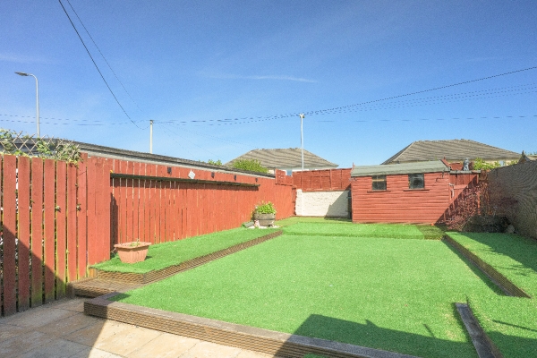 Externally, the property boasts a generously sized rear garden designed with low maintenance in mind. Predominantly laid with artificial lawn, the space is complemented by a large patio area ideal for outdoor seating and entertaining. The garden is fully enclosed for privacy and includes two garden sheds along with a hidden storage area, providing excellent practical outdoor storage.