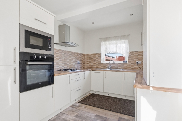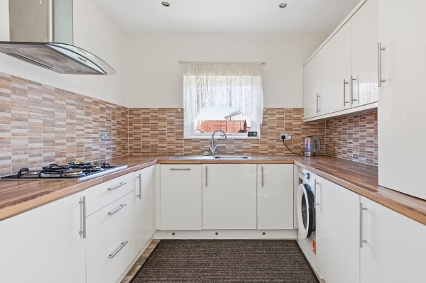 To the rear, the kitchen combines style and practicality. Enhanced by two windows allowing light to flow throughout, the space is fitted with high gloss ivory units, ample worktop space, a four-burner gas hob, double oven, and integrated appliances including a dishwasher and fridge freezer.