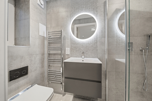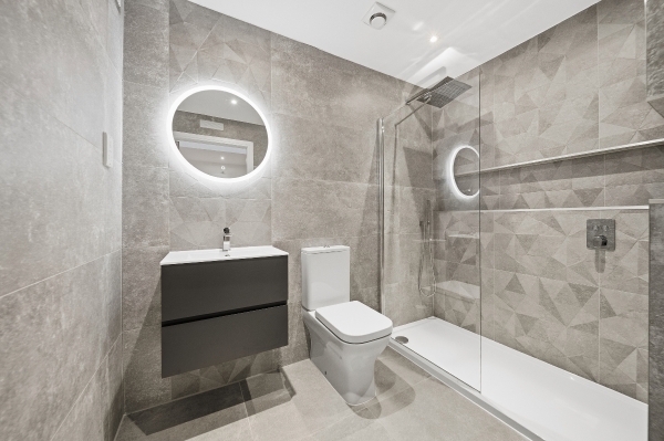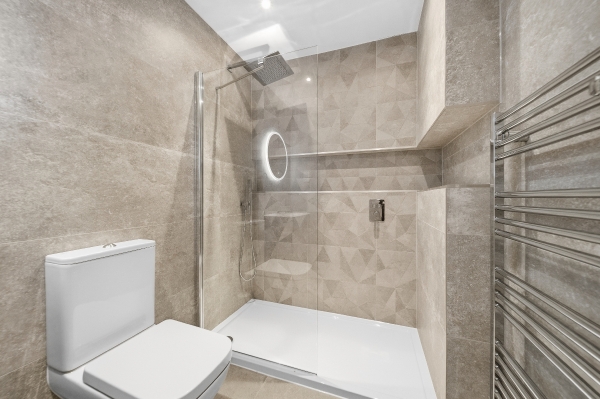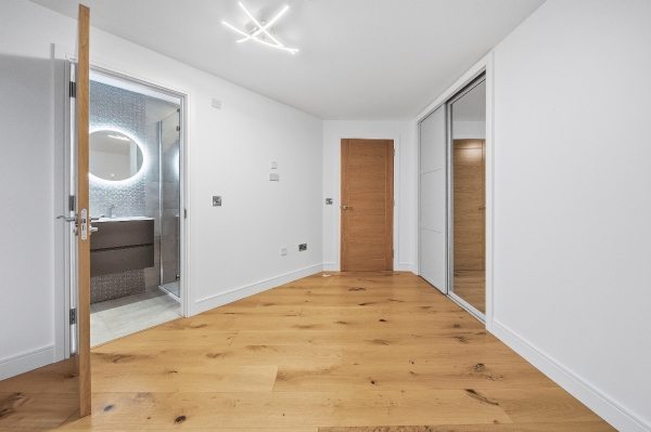 The principal suite is a calm, light-filled retreat featuring fitted wardrobes, remote-controlled blinds, direct access to a private glass balcony and a superb Porcelanosa en-suite finished with high-end tiling and contemporary fittings. The second bedroom enjoys its own equally refined en-suite and integrated storage, creating an ideal guest suite. A third generous double bedroom, complemented by a further beautifully finished WC and excellent storage, completes this level. In total, the home benefits from four bespoke Porcelanosa bathrooms, each individually designed and finished to an exceptional specification.