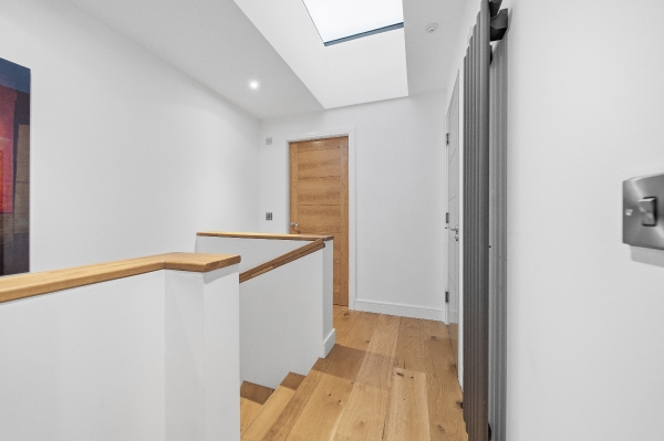 A bespoke hand-crafted solid oak staircase leads to the upper level where the living space is truly outstanding. Floor-to-ceiling glazing frames panoramic 360-degree views across the surrounding area — almost like living within a moving landscape painting. Natural light pours into the open-plan lounge, dining and kitchen space, enhancing the sense of scale and openness.