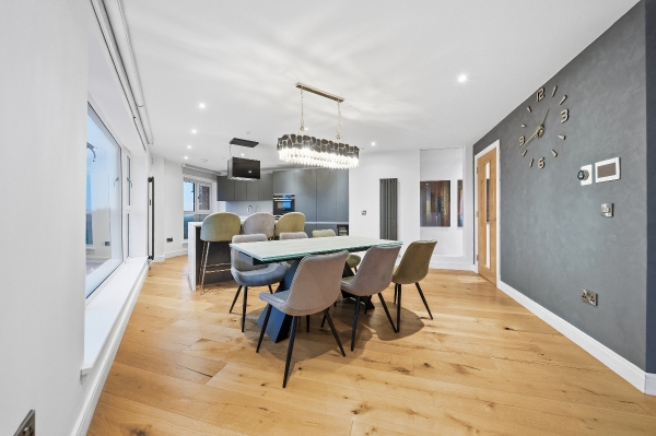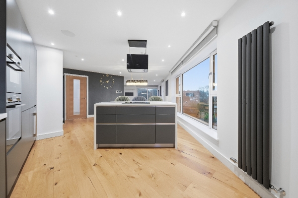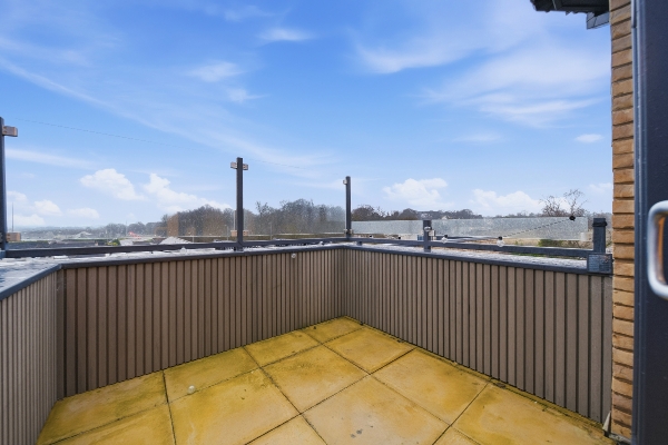 The Porcelanosa kitchen is finished with Krion worktops, a Quooker tap and integrated appliances, complemented by a separate utility room and additional shower room for convenience. From this level, doors open onto the substantial private rooftop terrace — a spectacular outdoor space ideal for entertaining or relaxing while enjoying the far-reaching outlook. A Juliet balcony further enhances the living area, creating a seamless indoor-outdoor connection rarely achieved in apartment living.