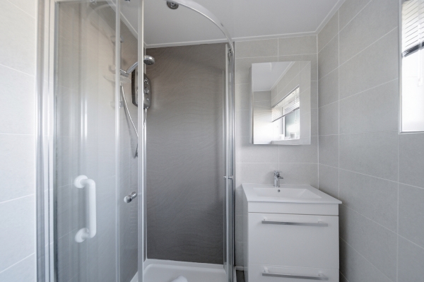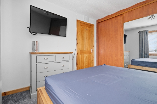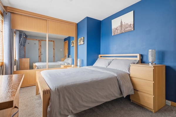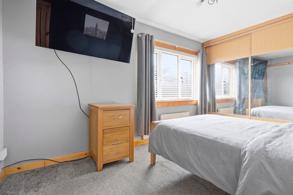 Upstairs, two generous double bedrooms offer excellent storage. The family bathroom is beautifully finished with on-trend tiling, contrasting wet wall within the shower area, vanity storage and a heated towel rail — a space that feels both practical and polished.