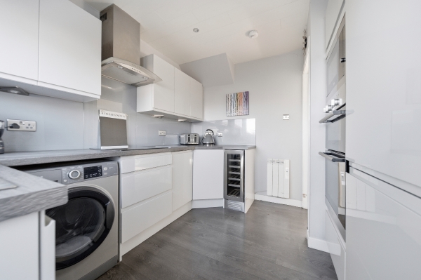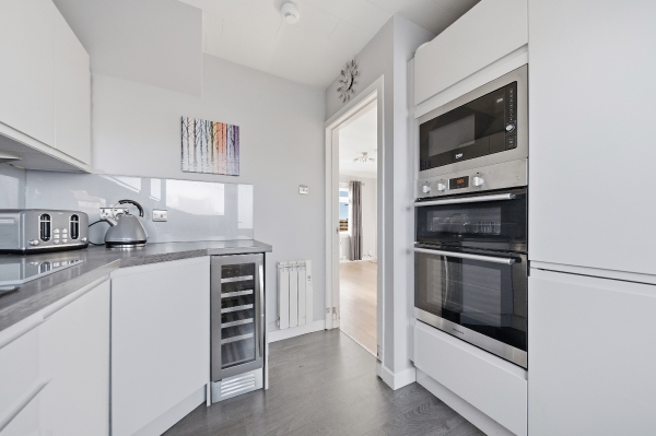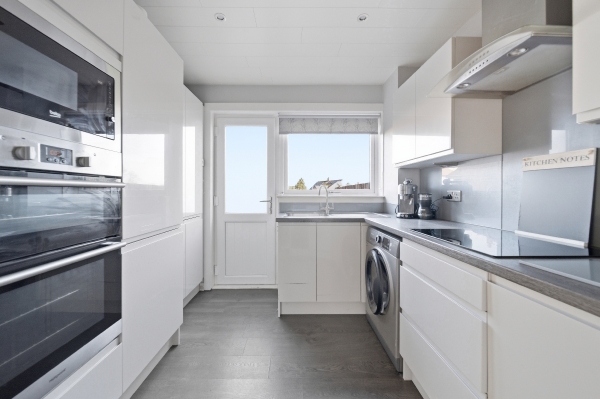 The kitchen is a real highlight. Installed in 2017, it features stylish cabinetry, contrasting worktops and integrated appliances including fridge freezer, microwave, double oven and electric hob, with a freestanding washing machine included. The finish is contemporary and cohesive, with direct access to the rear garden — ideal for everyday living.