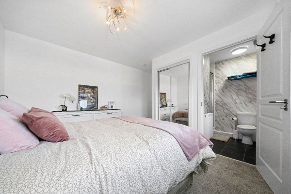 The property boasts a well-appointed dining kitchen, fully equipped with an integrated hob, oven, and hood, catering perfectly to those who enjoy cooking and entertaining. Accommodation comprises three well-proportioned bedrooms; the master suite is a true highlight, featuring fitted wardrobes and the added luxury of a private en-suite shower room. A family bathroom, featuring partial tiling and an over-bath shower, completes the internal layout.