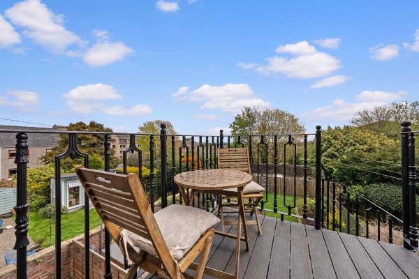 At the heart of the property is a modern, fully fitted kitchen, thoughtfully designed and open plan to the dining area, which has a working feature log burner perfect for contemporary living and hosting. This sociable layout offers both practicality and style in equal measure with a beautiful balcony looking over the rear garden which can be accessed via the spiral staircase.
